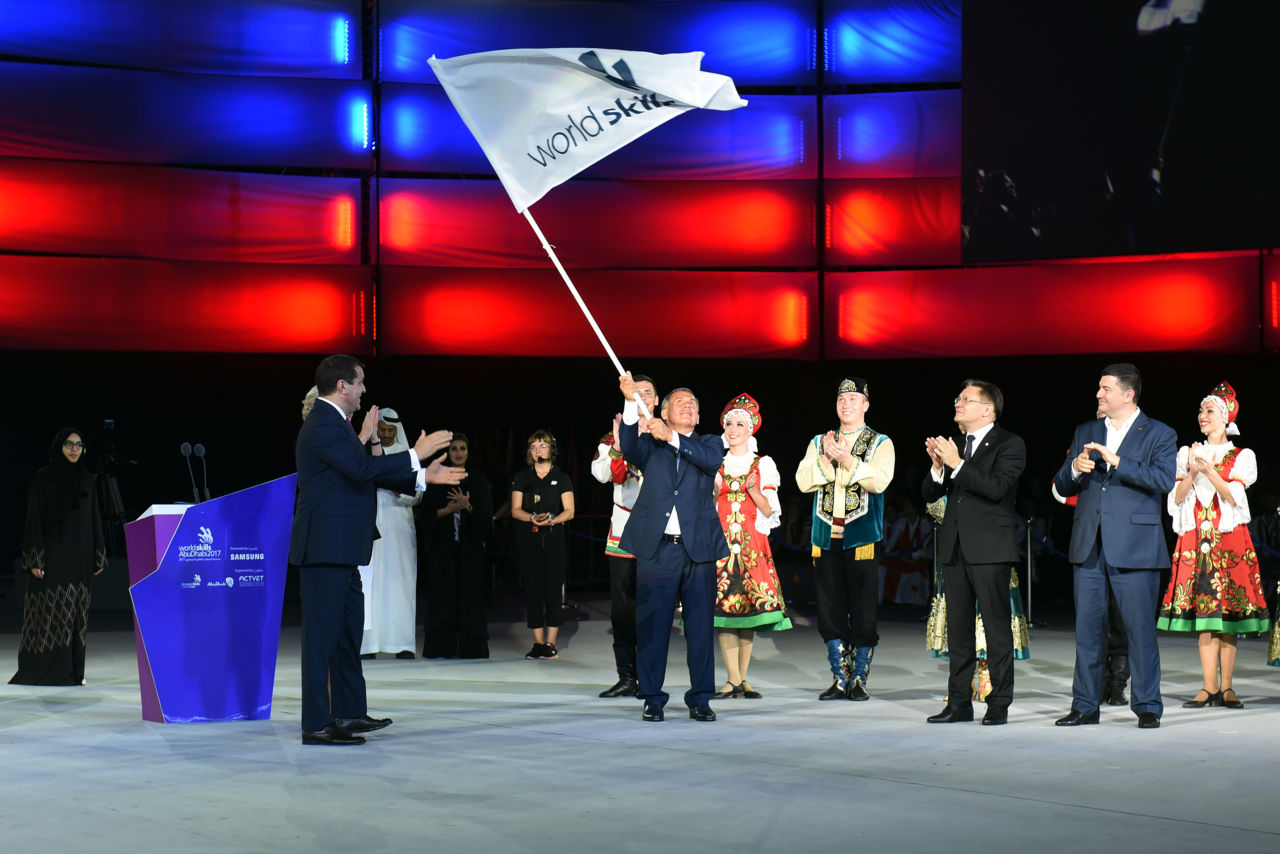 The WorldSkills Abu Dhabi 2017 Competition Organizers, represented by His Excellency Mubarak Saeed Al Shamsi, Director General of the Abu Dhabi Centre for Technical and Vocational Education and Training, and Mr Ali Al Marzouqi, CEO of WorldSkills Abu Dhabi 2017, handed over the WorldSkills flag to representatives of the Organizing Committee of WorldSkills Kazan 2019.