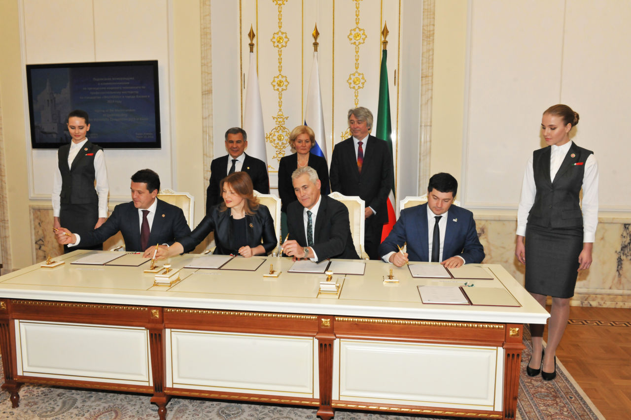 The MOU was signed by Ilsur Metshin, Mayor of Kazan, Natalya Zolotareva, the WorldSkills Official Delegate from Russia, Robert Urazov, WorldSkills Russia Director General, Rustam Minnikhanov, Tatarstan President, and WorldSkills International representatives Simon Bartley, President, and David Hoey, CEO. The Deputy Prime Minister of the Russian Federation, Olga Golodets, represented the Federal Government in the signing ceremony.